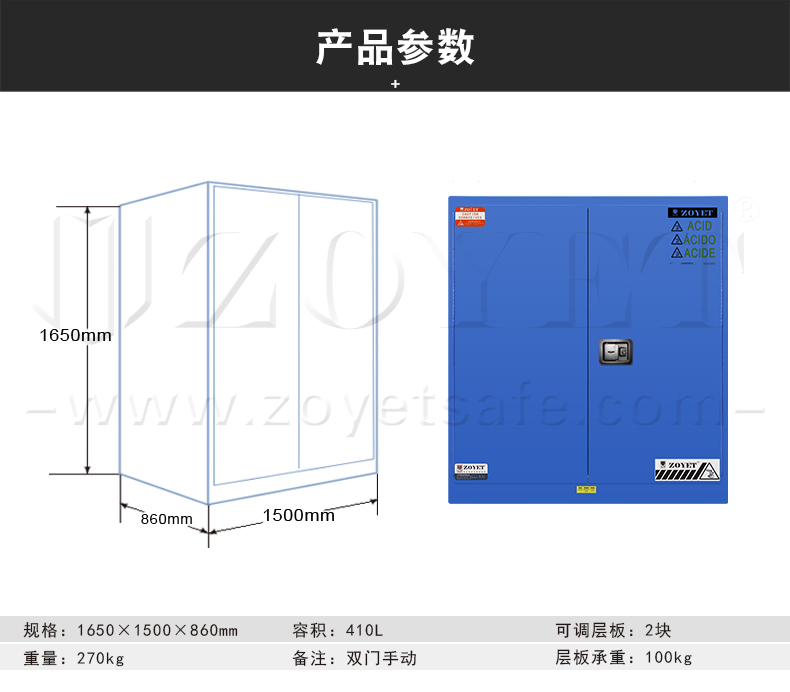 產(chǎn)品介紹:是指容積為110加侖/410升的一種用于存放腐蝕性液體的藍(lán)色防爆柜。
